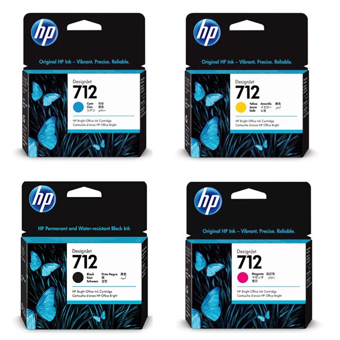 The HP 712 Ink Cartridge Set includes Black, Cyan, Magenta, and Yellow ink cartridges designed for reliable everyday printing.