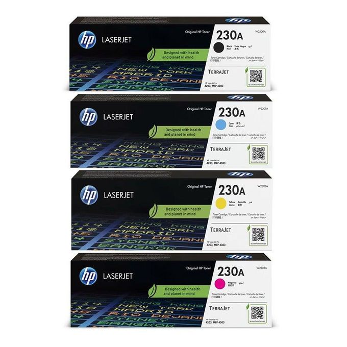 Complete Color Set: Includes four original HP toner cartridges — Black (W2300A), Cyan (W2301A), Magenta (W2303A), and Yellow (W2302A).